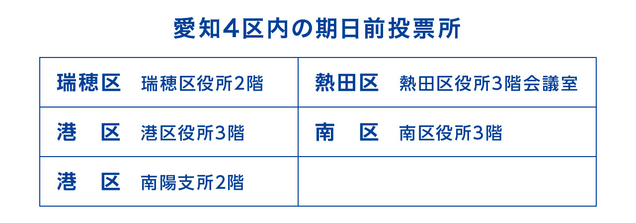 各区に開設された期日前投票所で、公示日の翌日〜投票日の前日(11日間 8:30〜20:00)まで、期日前投票をおこなうことができます。 期日前投票は「選挙のお知らせ」をお持ちでなくても、投票することができます。